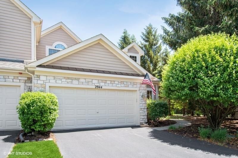 Desirable end-unit, 3 bed, 2.1 bath! This spacious townhouse in Naperville has a great view to a local pond. First floor primary bedroom suite with pond views! Vaulted two story ceilings in entryway, living room, and kitchen. Open concept with updated kitchen and custom floors. Hardwood floors throughout first floor, carpet upstairs with two more bedrooms and a large loft. Backyard boasts private paver patio, views of the pond, and mature trees. Also offers a large unfinished basement. Make this house your home by setting up your showing today!